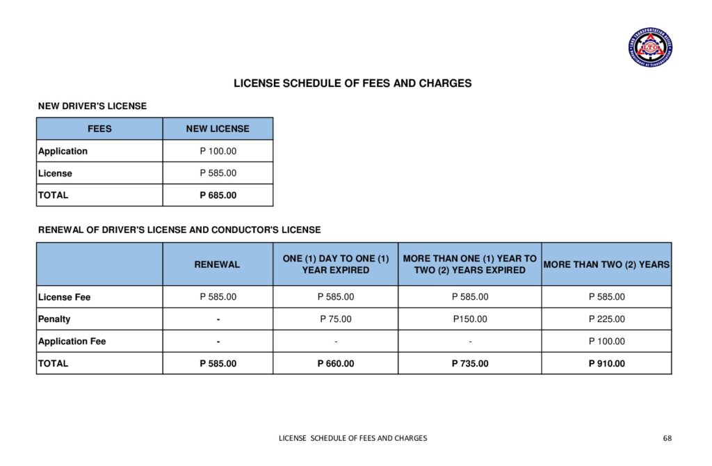 Change Classification Fee | P 100.00 | Applicable when changing a valid Non-Professional Driver’s License (NPDL) to a Professional Driver’s License (PDL), a valid PDL to NPDL, or expired NPDL to PDL/PDL to NPDL |